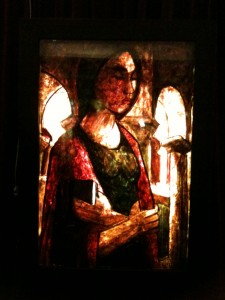 Les créations sont sous cadre, jouant avec la lumière, base de leur création. Vous trouvez d’autres compositions utilisant les gemmaux dans la basilique Saint Pie X au sanctuaire.
