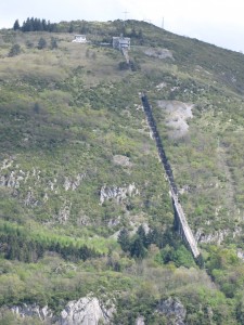 Car s’il est possible de se rendre au sommet du Pic du Jer uniquement de façon pédestre, la solution la plus utilisée par les personnes qui montent consiste à emprunter le funiculaire construit en 1900 et qui mène à la station funiculaire du Pic du Jer, à 888 mètres d’altitude précisément. Il vous faudra terminer à pied pour atteindre le sommet du Pic du Jer à environ 1000 mètres d’altitude. Quasiment du pied du Pic du Jer à son sommet, le funiculaire électrique sur lequel une cabine grimpe les 838 mètres jusqu’à la « station funiculaire » pendant qu’une autre cabine descend elle au même moment depuis le sommet. Cette astuce permet à la fois de fluidifier le trafic des passagers tout en limitant le plus possible le tronçon du parcours où les deux voies doivent se croiser, ce qui permis sans doute de limiter les travaux et donc leur coût et par la même occasion de dénaturer le moins possible.